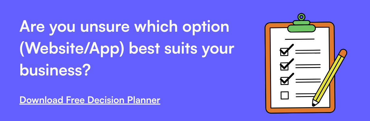 Download our FREE interactive “App or Website? Decision Planner”. Fill it out step by step to see whether a mobile app, website, or both is best for your business.